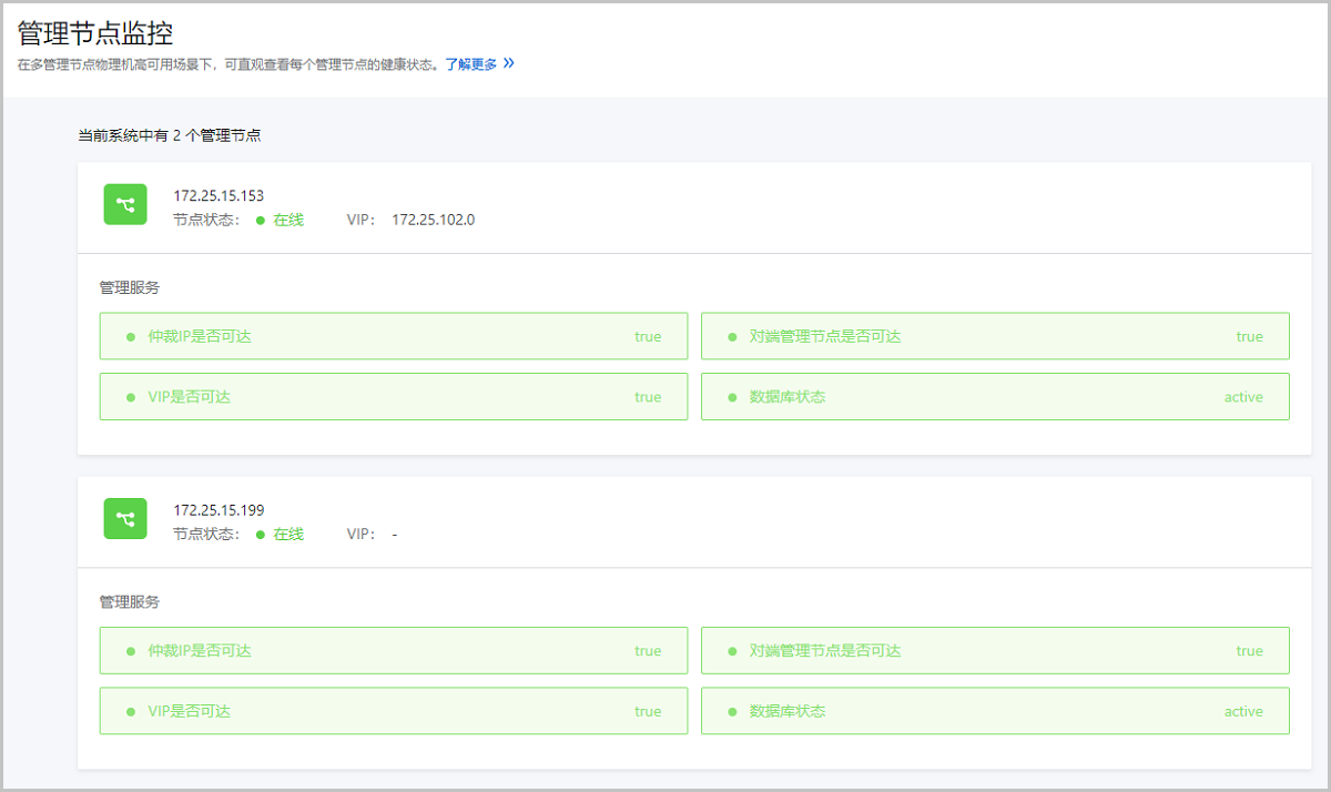 在多管理节点物理机高可用场景下,可直观查看每个管理节点的健康状态。