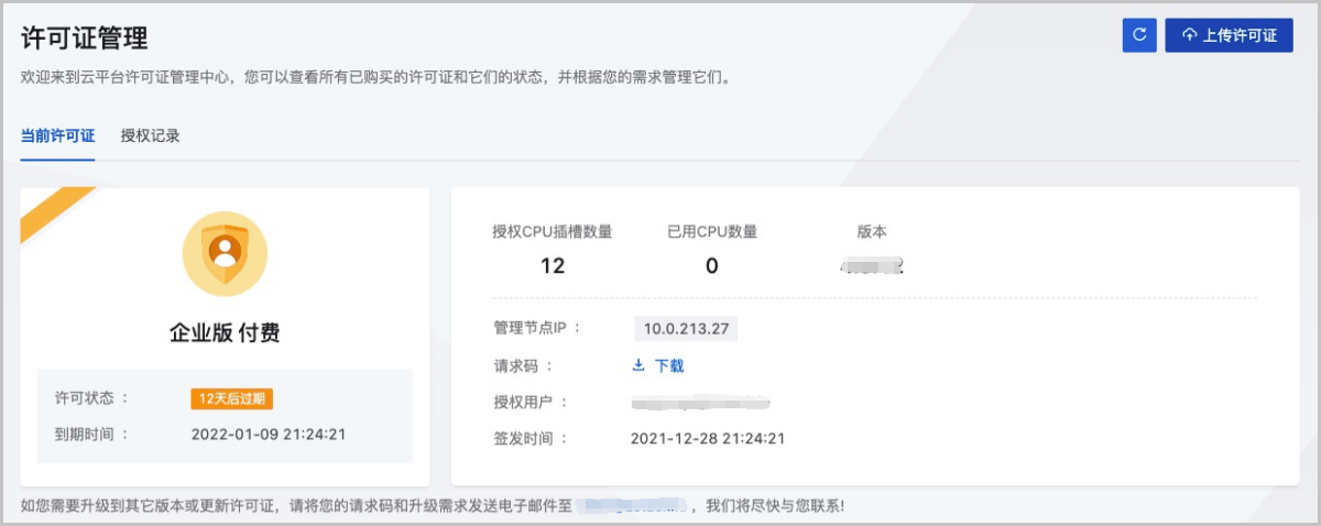 • 请求码:通过请求码申请授权,并将获取到的许可证文件本地上传,完成安装。