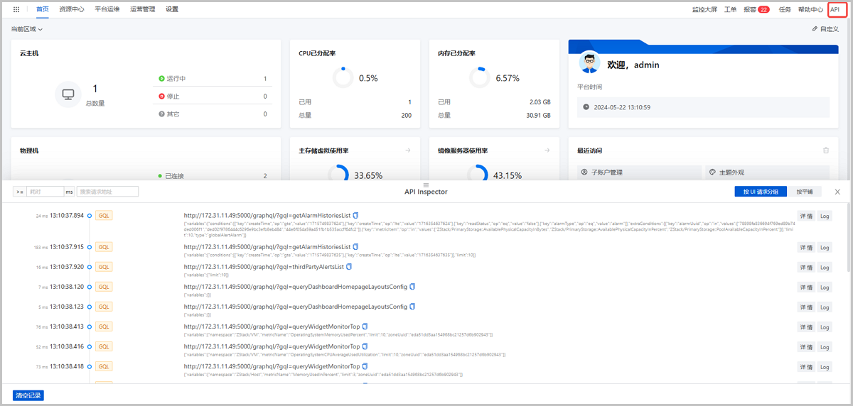在之前版本中,ZStack Cloud已支持API Inspector运维工具,监测和展示云平台操作所关联调用的API信息,帮助用户进行问题排查或第三方工具调试,大幅提高开发运维效率。