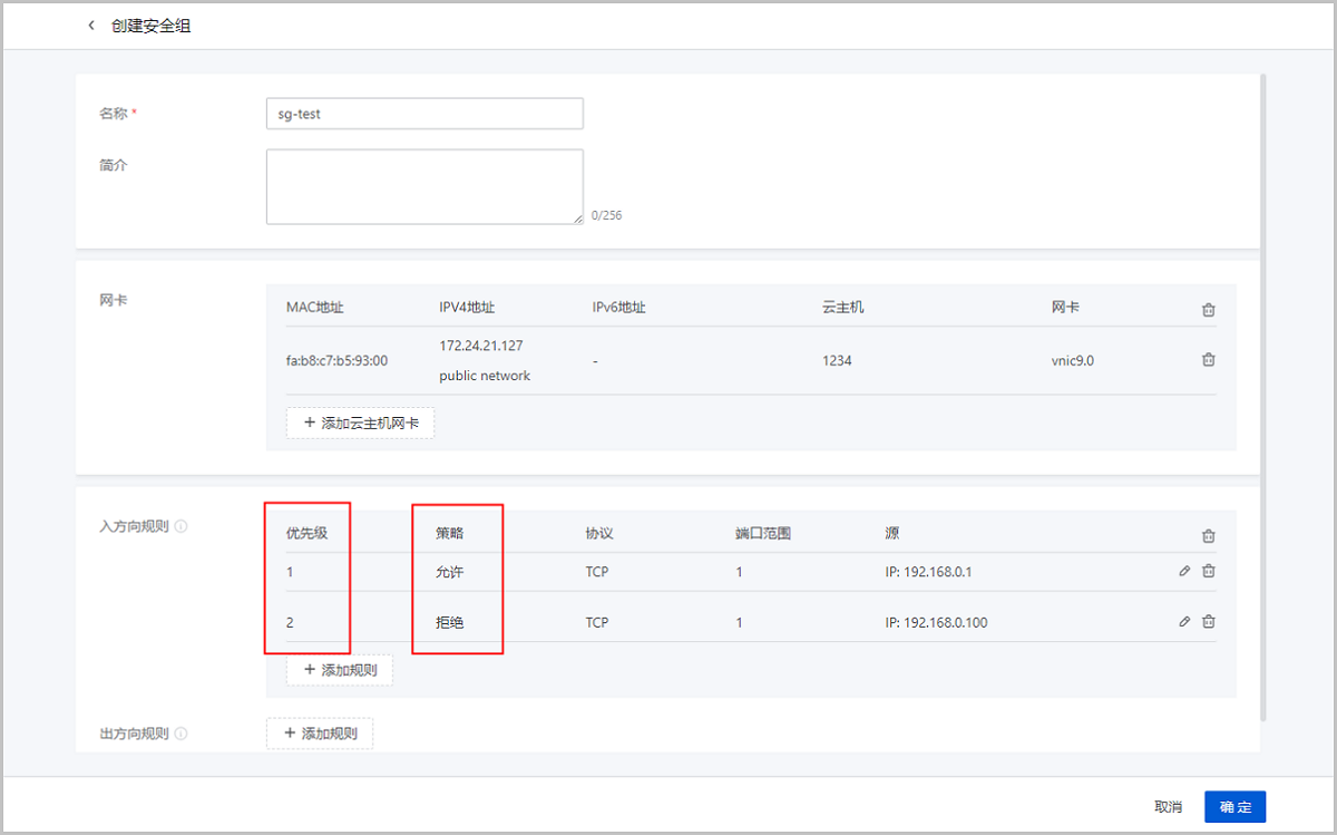 在之前版本中,已支持一张网卡绑定多个安全组。ZStack Cloud 4.7.21开始,支持为多个安全组设置优先级,网卡将优先匹配优先级较高的安全组下的规则。