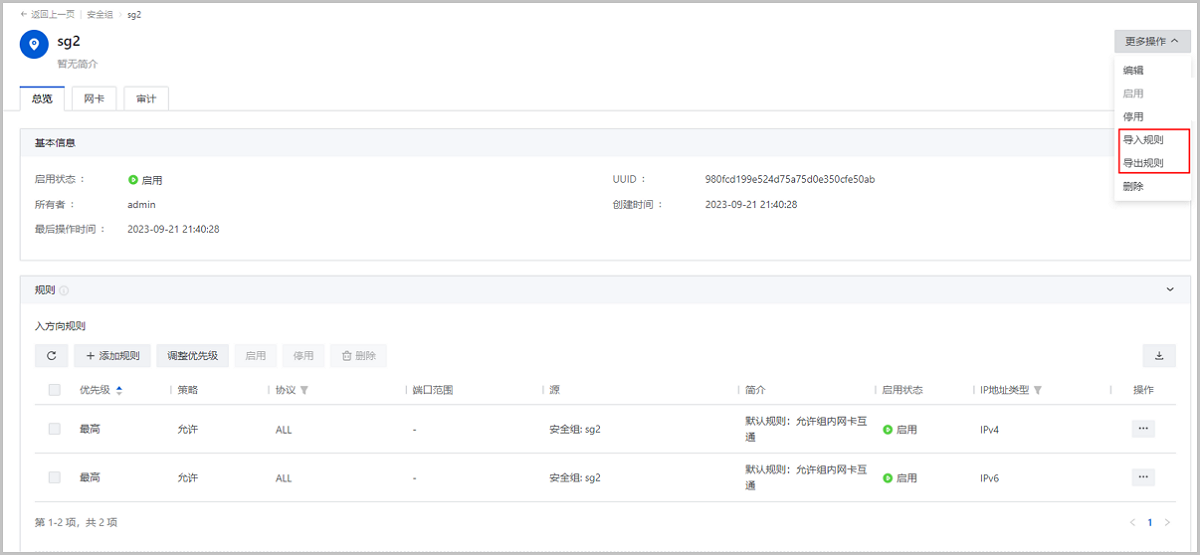 ZStack Cloud 4.7.21开始,支持安全规则导入导出,用户可导出当前安全组上的规则,并导入到另一个安全组中,快速完成规则配置。