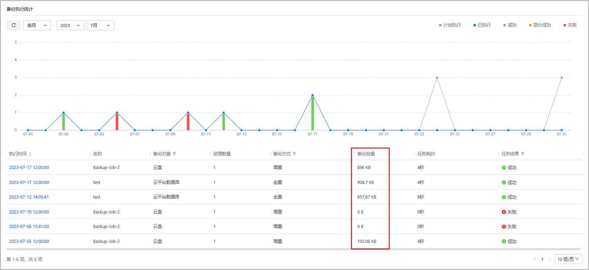 ZStack Cloud 4.7.11开始,备份任务执行统计列表新增展示备份容量,任务详情新增展示备份方式和备份容量。用户可直观查看备份完成后产生的备份数据量总计和备份类型,提升运维效率。