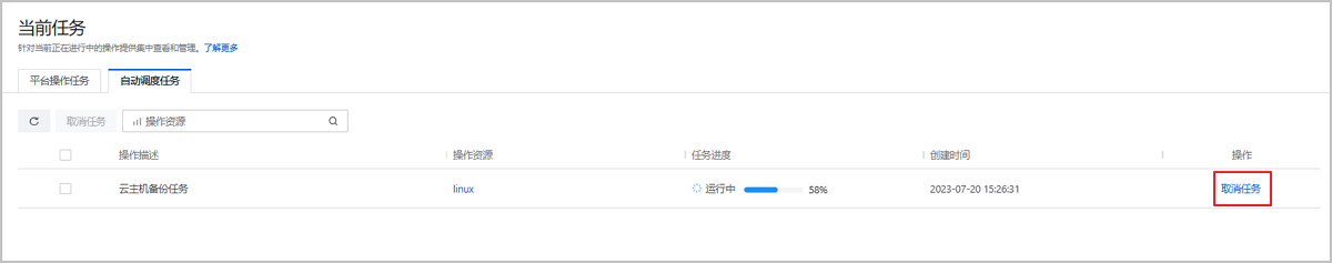 ZStack Cloud 4.7.11开始,云平台当前任务页面新增“自动调度任务”子页面,用于展示通过备份策略触发的或手动执行的正在进行中的备份任务,用户可点击“取消任务”按钮来取消执行备份任务。
