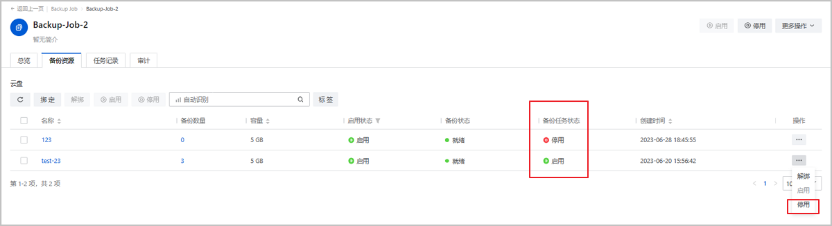 • 启用:点击启用后,已停用且未进行云主机/云盘备份的任务,将在下一次备份任务进行时重新加入备份。若未点击启用,则后续备份任务的执行将过滤掉备份任务状态为“停用”的备份资源。