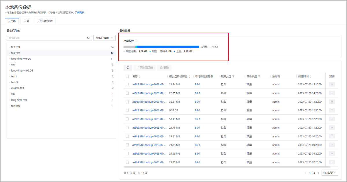 ZStack Cloud 4.7.11开始,本地备份数据页面左侧云主机列表按根云盘备份容量排序时,列表展示容量包含增量依赖的数据量,确保备份数据量之和与备份服务器实际占用数据量相符。