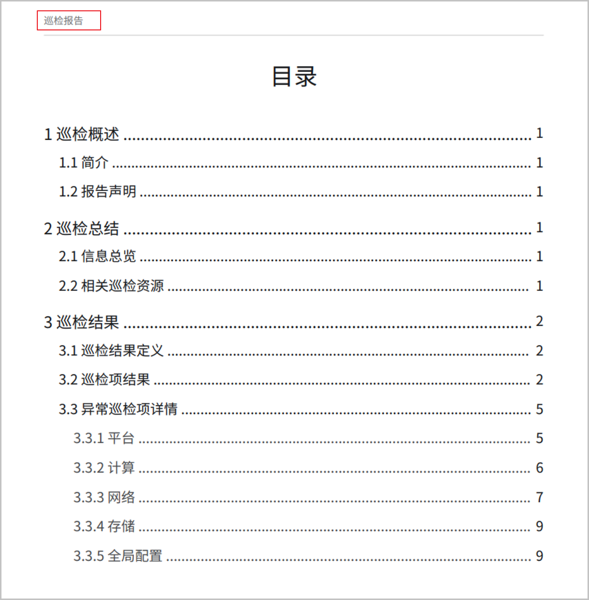 支持导出PDF格式的巡检报告,内容包括:巡检概述、巡检总结以及巡检结果,其中对于异常巡检项,支持查阅巡检项详情及相关巡检建议。