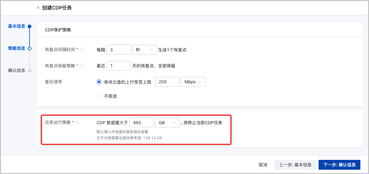 初次创建CDP任务时,云平台根据算法智能推荐CDP任务规划容量,帮助用户合理规划备份空间,防止备份服务器空间被过度占用。