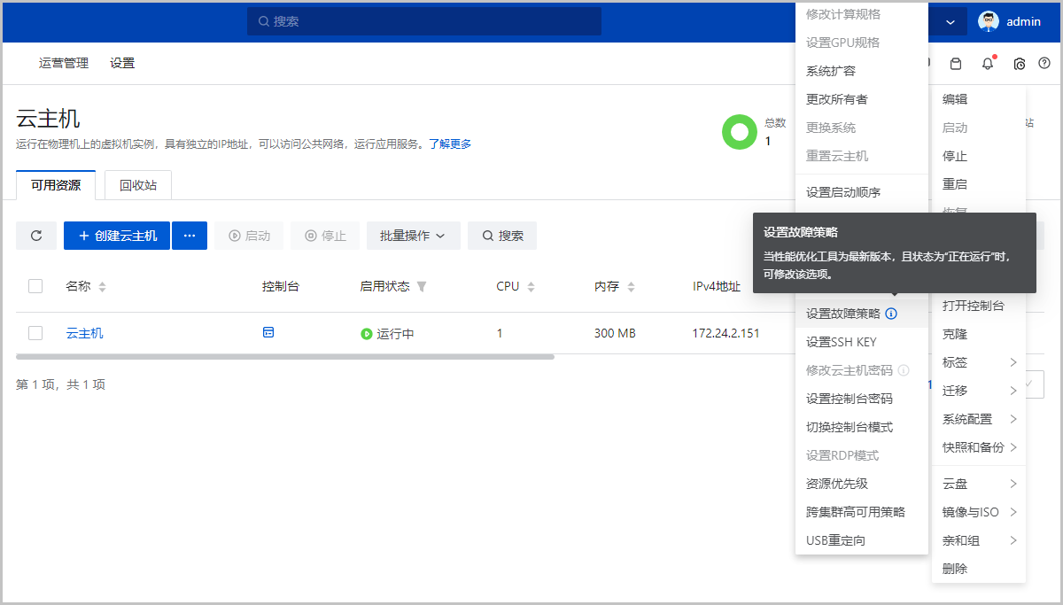 ZStack Cloud 4.2.0支持自动处理云主机故障,用户可在云平台中按需配置云主机的故障处理策略,当云主机出现故障时,系统将按照已配置的策略自动处理,节省运维人力,保证云主机正常运行。