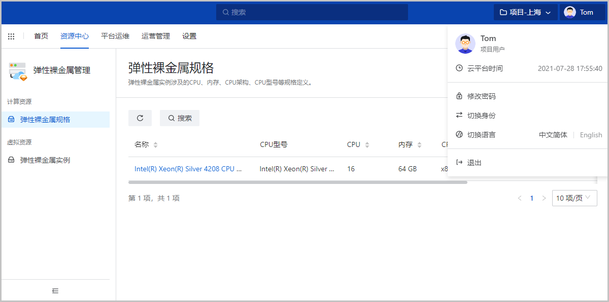 ZStack Cloud 4.2.0开始,弹性裸金属管理支持多租户。针对企业管理中的项目成员(项目负责人/项目管理员/普通项目成员)开放弹性裸金属管理模块使用权限,项目成员可通过管理员共享的弹性裸金属规格创建弹性裸金属实例。