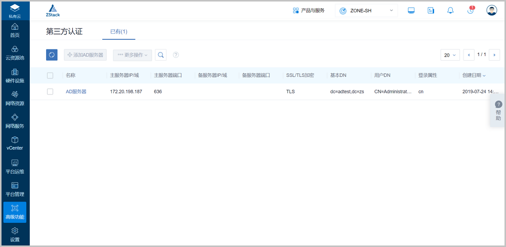 ZStack 3.5.2支持第三方认证对接,当成功添加AD服务器至云平台后,相应AD域中的全体用户以及组织架构会自动化批量导入至云平台,如图 1所示: