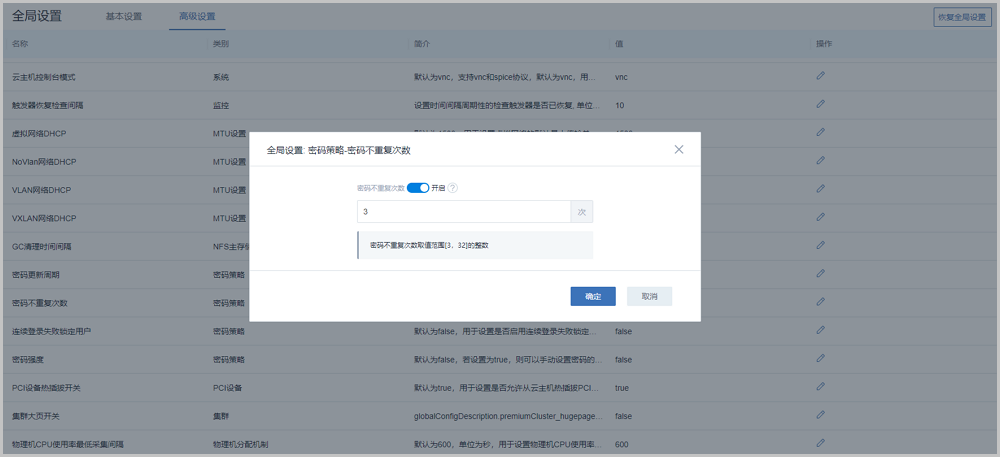 在全局设置中开启“密码不重复次数”开关后,用户可自定义设置密码不重复次数。例如:若设置为3,表示新密码不能与之前3次已使用过的历史密码相同,如图 3所示: