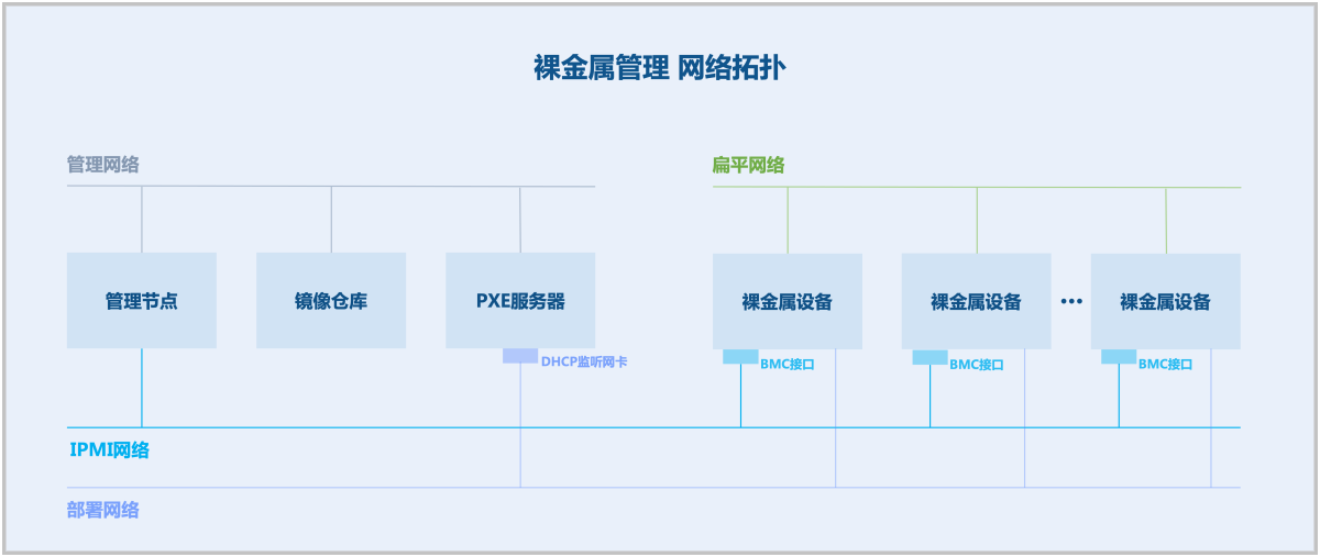场景设定:假定某用户由于业务需要,需批量部署若干台专属的高性能物理服务器,并实现无人值守批量安装裸金属主机操作系统。在某业务网络场景下(扁平网络),要求同一个二层网络上的物理服务器与业务云主机实现互通。