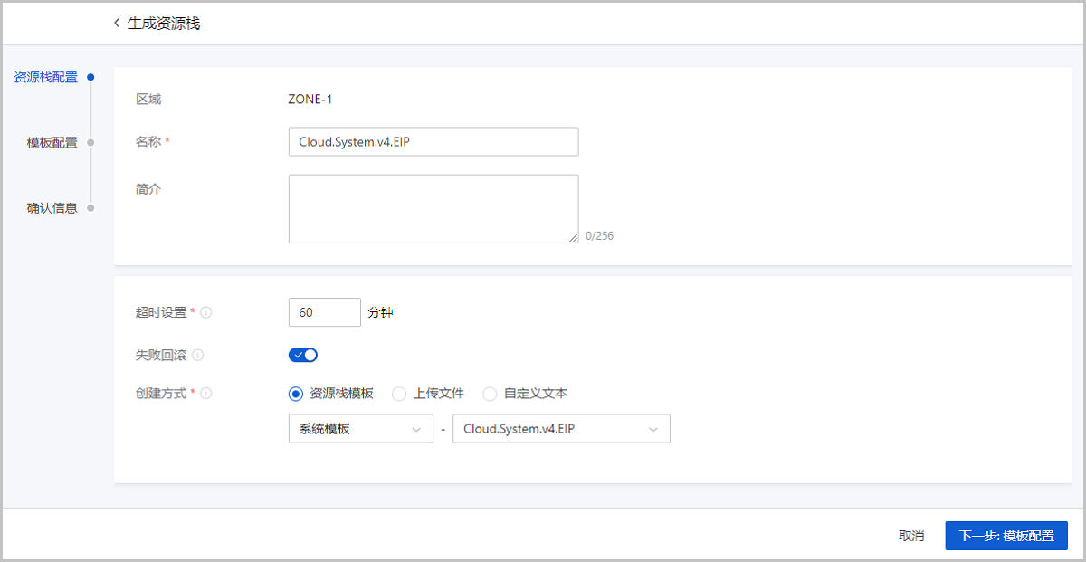 模板配置项与所选的模板有关,不同类型的资源栈需要输入的参数不同,本章节以ZStack.System.v4.EIP模板为例。