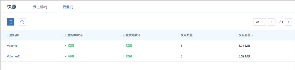 在ZStack私有云主菜单,点击 ,进入云盘界面,选择某一云盘,在云盘详情页的云盘快照子页面,可查看云盘快照树中每个快照节点容量。