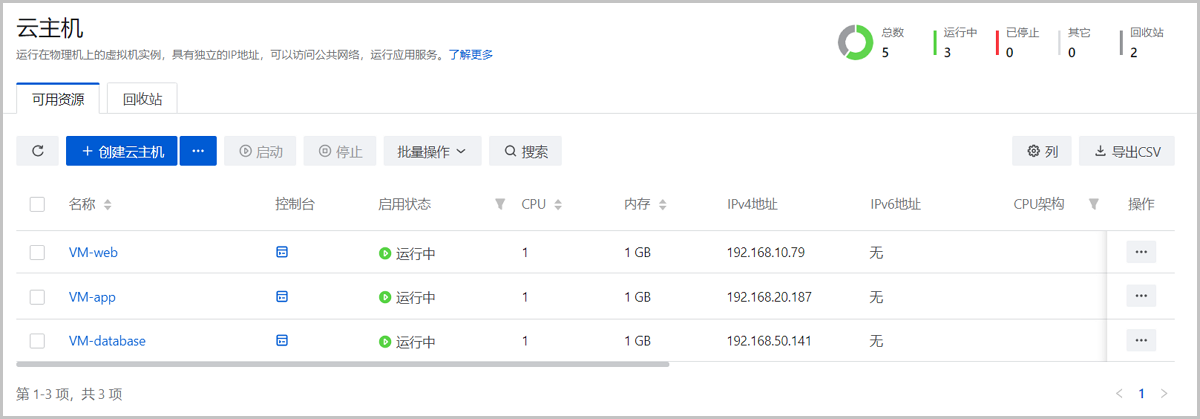 点击确定按钮,创建两个双栈云主机(VM-双栈-1和VM-双栈-2)。