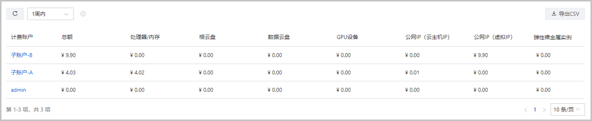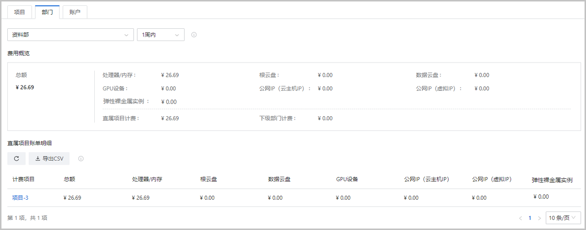 汇总账单显示指定时间段内项目/部门/账户的计费账单,方便用户快速了解近期消费情况。
