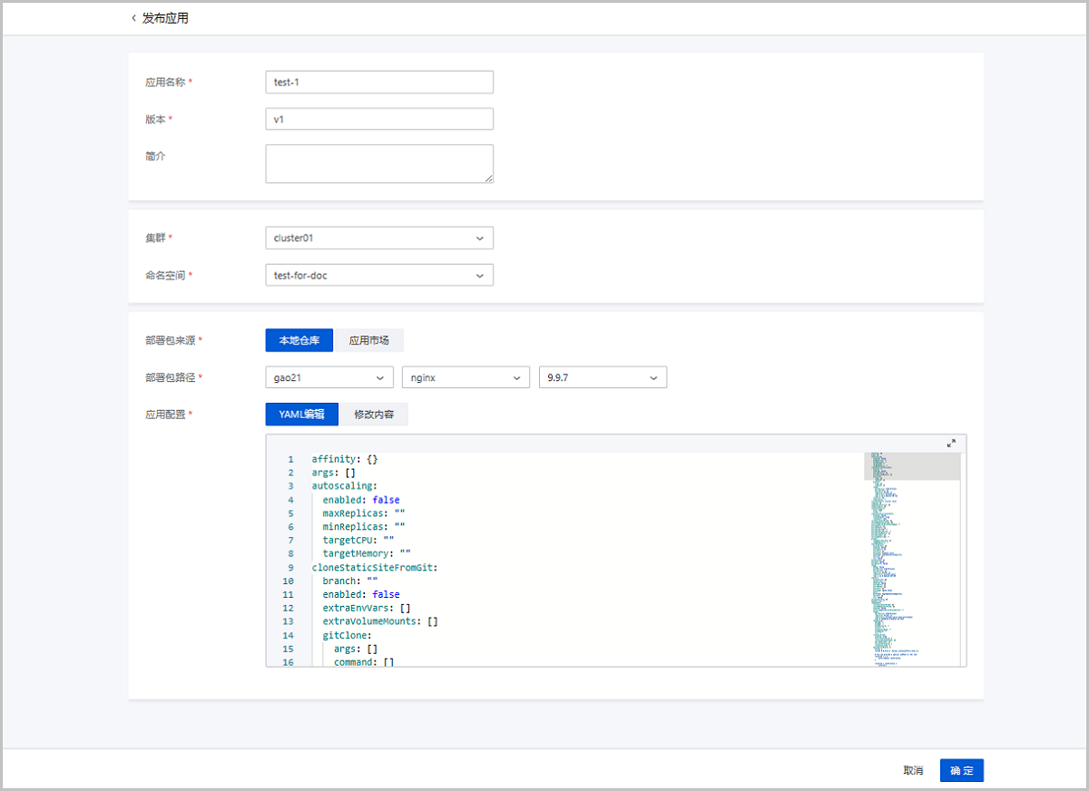 发布应用指将Chart部署包发布到集群,部署一个应用实例。用户可在应用或制品仓库界面以两种方式发布应用,本节主要介绍通过应用界面的发布方式。