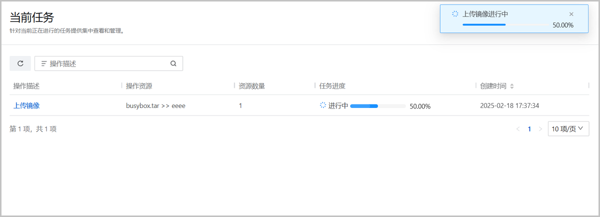 • 支持调整每页显示的进行中任务数量,可选值为:10、20、50、100,且支持翻页操作。