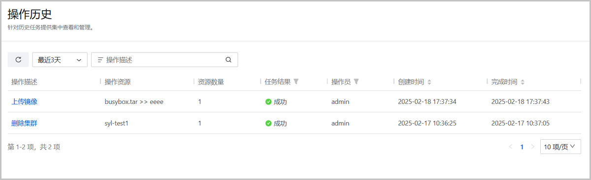 该页面展示所有已完成操作信息,包括作描述、操作资源、资源数量、任务结果、操作员、创建时间、完成时间。