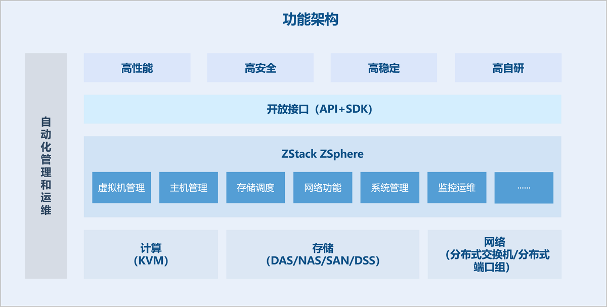 ZStack ZSphere基于高性能、高安全、高稳定、和高自研的核心理念,具备ZStack Cloud平台引擎与4S特性,使用服务器虚拟化、网络虚拟化、存储虚拟化等前沿技术,兼具智能高级运维能力,是一款面向下一代的服务器虚拟化软件。用户可以利用ZStack ZSphere快速构建虚拟化数据中心,也可结合云轴科技丰富的产品线搭建从IaaS到PaaS的一体化方案。